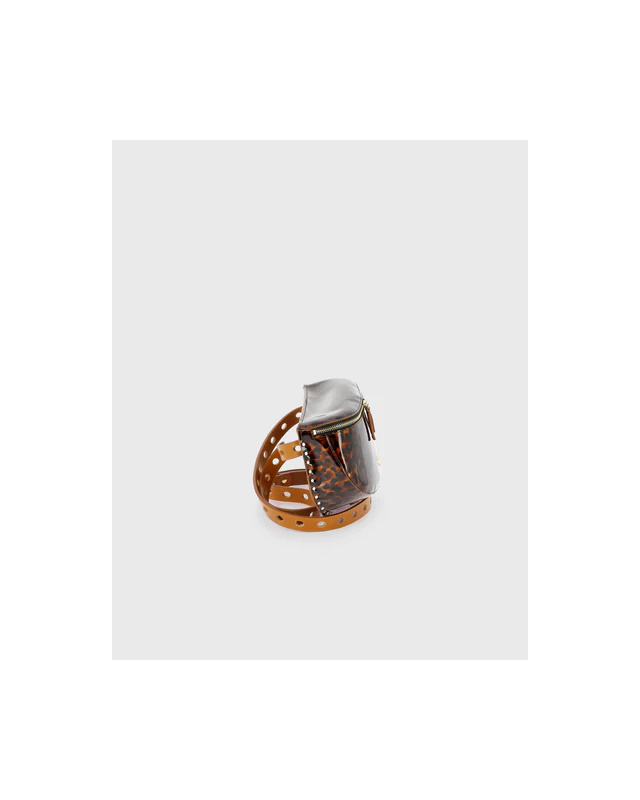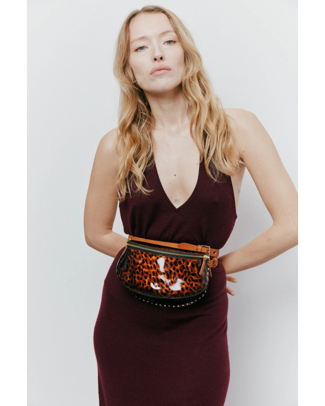 Patent cowhide leather printed in a tortoiseshell style Back and adjustable strap of 120 cm in full-grain camel cowhide leather with vegetable tanning