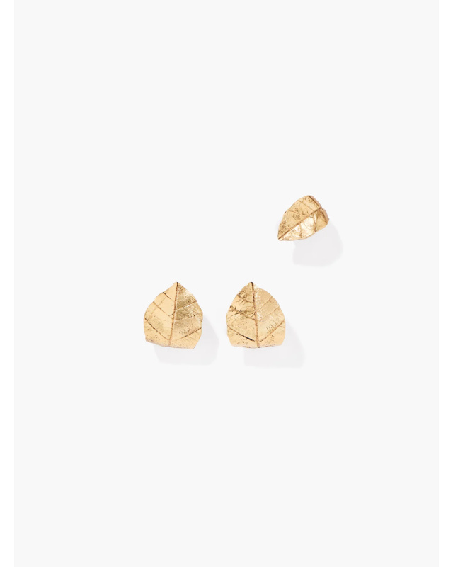 A symbol of modesty, the fig leaf is celebrated by the Ledena cuff, a spectacular piece due to its size as well as the molding, folding, and volume work required to create this botanical origami, complemented by a ring and earrings, one of which is enhanced by a delicate ear jewel.