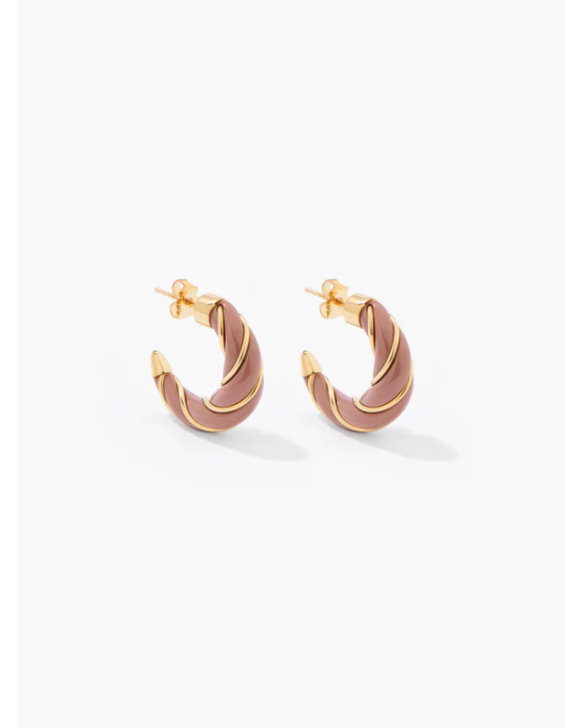 The twist of the Diana earrings is inspired by the hippie torques of the 60s, adorned with a golden thread that resembles a vine or wisteria, here available in cappuccino for the autumn-winter 25/26 collection. Diana earrings in burgundy-colored Bakelite, gilded with 18-karat yellow gold.
