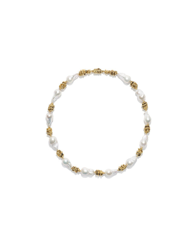 Baroque pearl necklace from the Riviera collection. A key piece from the new Riviera collection. Baroque pearls with a pearly whiteness paired with golden metal pearls, now a signature of the Maison. A pearl necklace for this new wardrobe of timeless pieces, to be worn day or night.