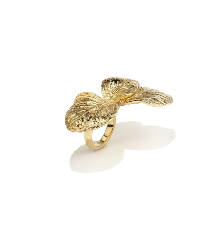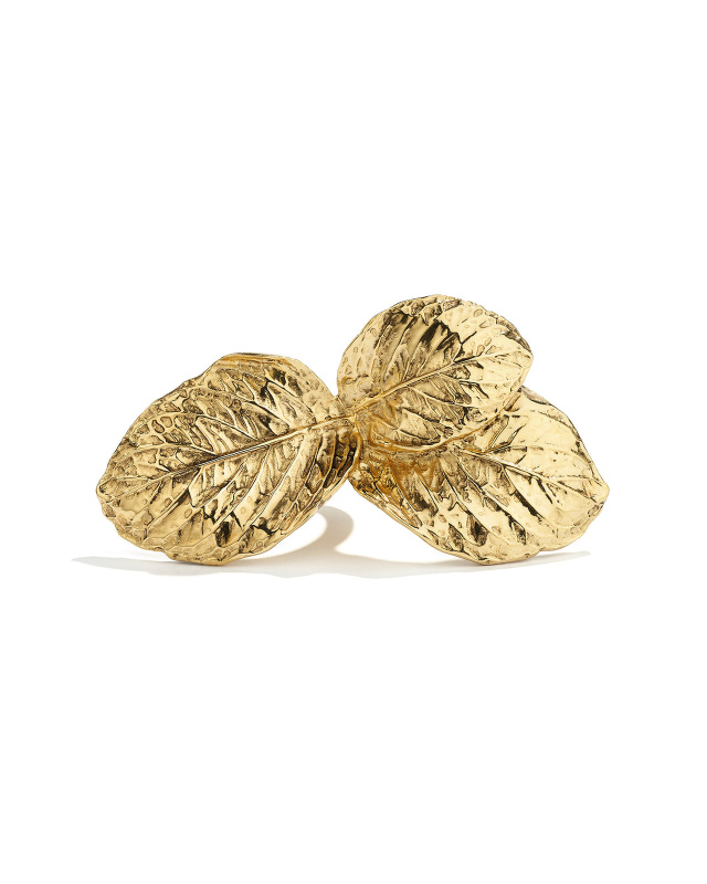 Bague triple feuille de la collection Balade. Goossens livre une nouvelle interprétation de la Nature. Cette bague dorée dont les feuilles se superposent dévoile un bijou au réalisme poétique et joyeux. Comme un bouquet de feuilles texturées.