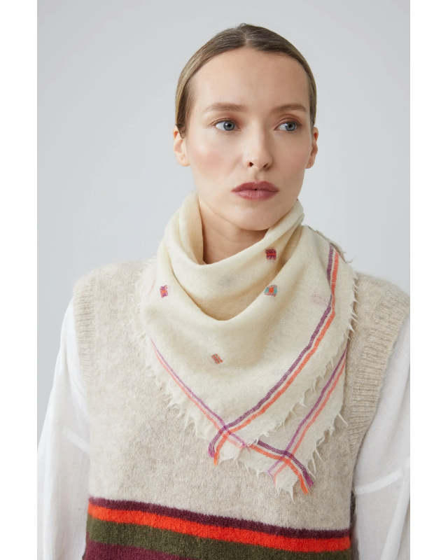Le foulard Chelsea N°815 célèbre l’art du tissage traditionnel avec ses petits motifs en forme de drapeaux, réalisés à la main selon la technique ancestrale indienne du jamdani. Son nom fait référence au quartier londonien de Chelsea, également célèbre pour son club de football — un symbole fort d’appartenance territoriale à un groupe, à une identité, à une passion partagée. Comme un étendard textile, ce foulard incarne ce lien invisible qui unit ceux qui se reconnaissent dans une même histoire. 100 % laine fine, Motifs drapeaux tissés en jamdani, technique artisanale indienne Format carré 70x70 cm, idéal à nouer autour du cou ou dans les cheveux.