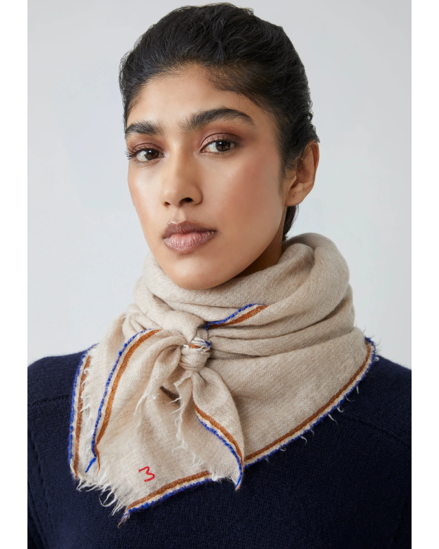 Tissé à la main dans un mélange précieux de cachemire et laine, ce carré de 90x90 cm s’inscrit dans l’héritage artisanal du clan, avec ses fines bandes contrastantes aux extrémités qui rappellent les motifs emblématiques, et sa broderie "M" discrète, symbole d’appartenance. Une pièce douce, chaude et raffinée, idéale à porter au quotidien. Mélange noble de 55 % cachemire et 45 % laine, tissé à la main.