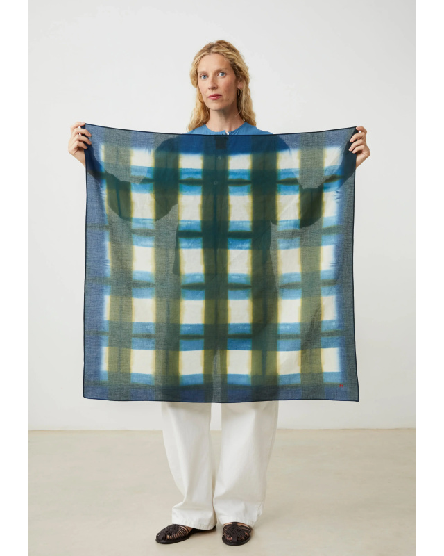 Le Foulard Yoko N°822 capte la lumière à travers un dégradé de grands carreaux réalisés selon la technique traditionnelle du shibori.
