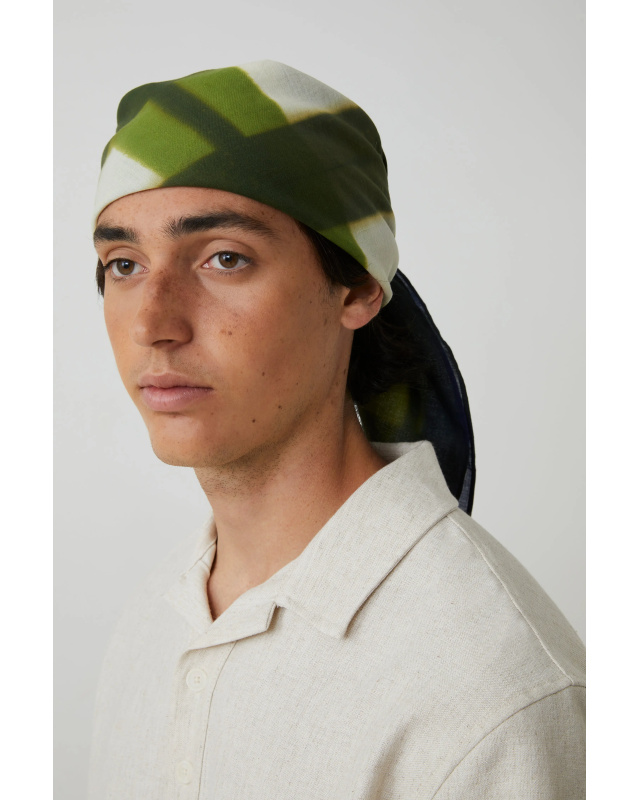 Chaque foulard est noué sur des blocs de bois avant teinture : le tissu absorbe la couleur partout sauf là où il est en contact avec le bois, rendant chaque pièce unique.