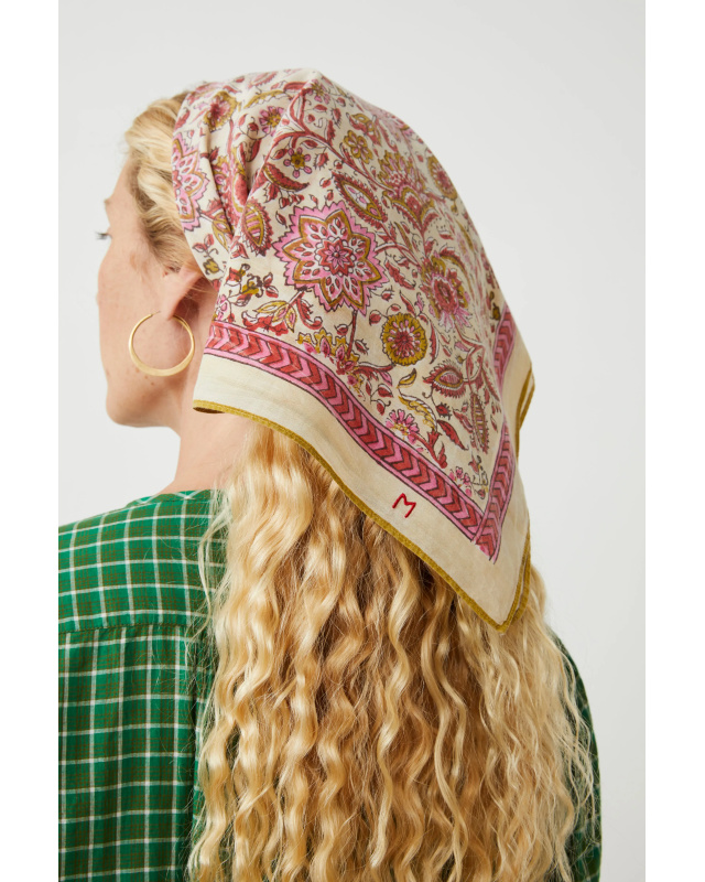 La broderie “M” signe la pièce discrètement, faisant de ce foulard un accessoire à nouer autour du cou ou dans les cheveux.